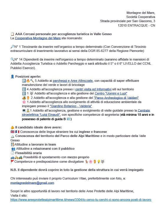 La Cooperativa Montagne del Mare sta ricercando: