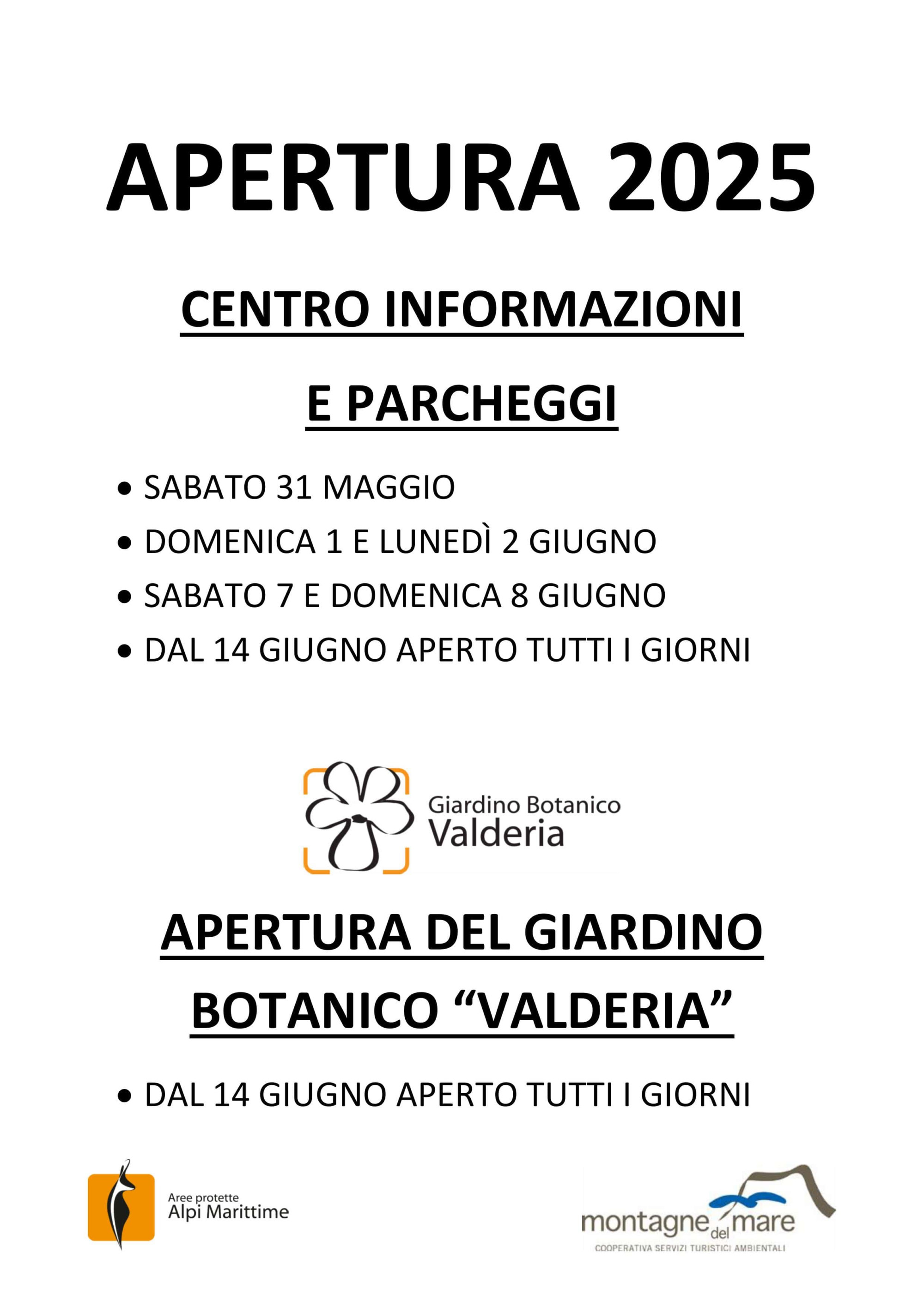 L'apertura del Giardino Botanico "Valderia" è prevista dal 14 Giugno tutti i giorni.